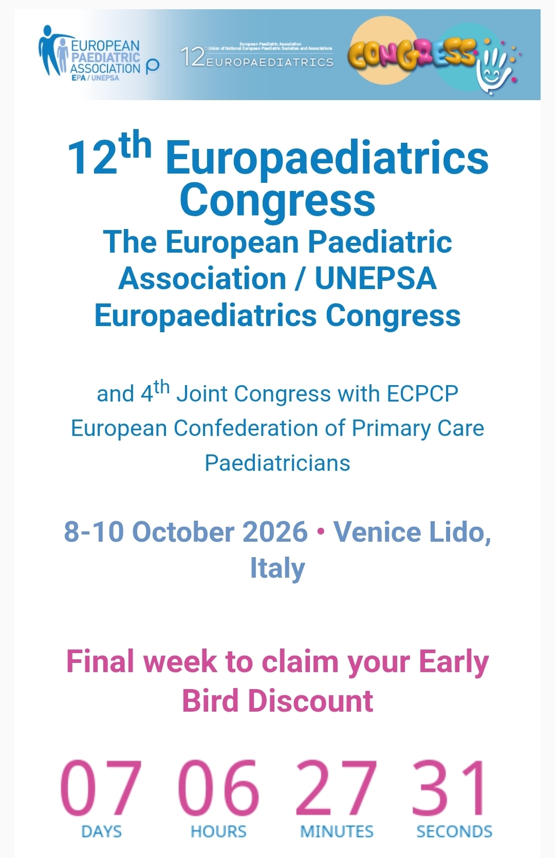 Only 10 days left to join the 12th Europaediatrics Congress 2026 at 50% OFF!